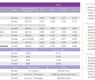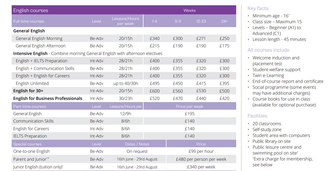 Londra, Dublin ve Eastbourne'dan üç ana konumdan birini seçin ve programınıza en uygun süreyi belirleyin; 1 ila 24 hafta arasında değişen seçenekler mevcuttur.